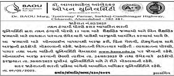 BAOU has invited online applications for the recruitment of Various 139 Posts 2025.